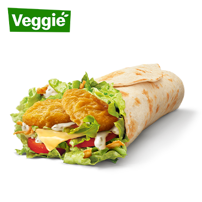 Craquez pour le McWrap® Veggie : des nuggets végétariens croustillants à base de protéines de blé et pois, du cheddar fondant, des tomates juteuses, de la salade et des oignons crispy, le tout relevé d'une sauce onctueuse et enveloppé dans une galette de blé moelleuse. C'est veggie, mais tout aussi irrésistible. Vous n'y croyez pas ? Goûtez-le et laissez-vous surprendre !