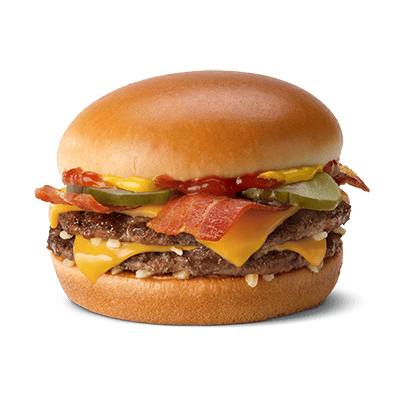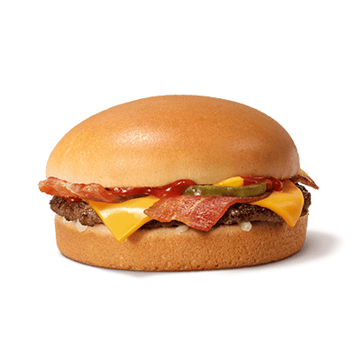 Un steak haché, une tranche de cheddar fondu, une rondelle de cornichon, des oignons, deux tranches de bacon, du ketchup et de la moutarde douce dans un pain bun : fondez pour son goût unique.